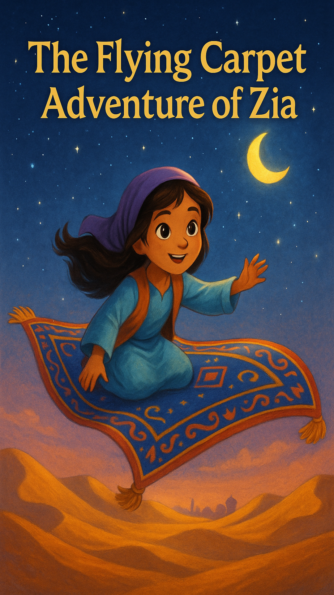Zia was a curious girl from the desert town of Noor. One day, she discovered an old flying carpet hidden in her attic.